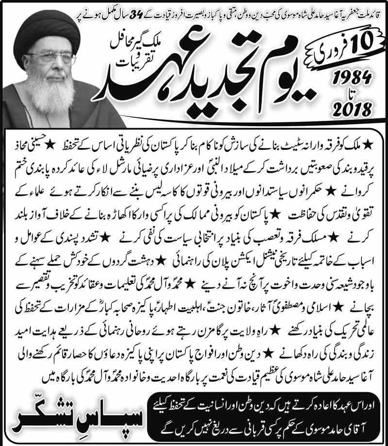 10فروری ۔ یوم تجدید عہد ۔ یوم تشکر 9 فروری, 2018 ولایت نیوز شیئر کریں نگاہ بلند سخن دلنواز جاں پرسوز ۔۔۔ یہی ہے رخت سفر میر کارواں کیلئے