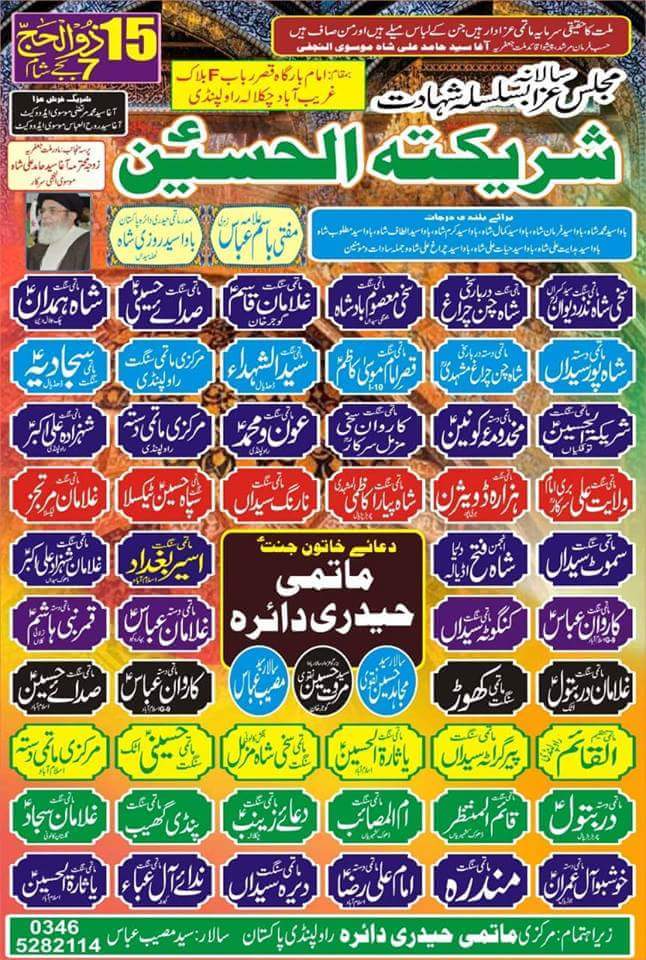 راولپنڈی (ولایت نیوز) شریکۃ الحسینؑ عالمہ غیر معلمہ بانی عزا فاتح کوفہ و شام نواسی رسولؐ ام المصائب سیدہ زینب بنت علی ابن ابی طالب ؑ کی شہادت کی مناسبت سے 27اگست پیر 15ذوالحجہ بعد از نماز مغربین مادر ملت جعفریہ زوجہ مرحومہ قائد ملت جعفریہ آغا سید حامد علی شاہ موسوی کی جانب سے امام بارگاہ قصر رباب ؑ چکلالہ راولپنڈی میں مجلس عزا و ماتمداری منعقد ہوگی ۔ مجلس عزا سے مفتی باسم عباس زاہری خطاب کریں گے ۔ پرسے کا اہتمام ماتمی حیدری دائرہ پاکستان کے سالار سید مسیب عباس کاظمی نے کیا ہے ۔