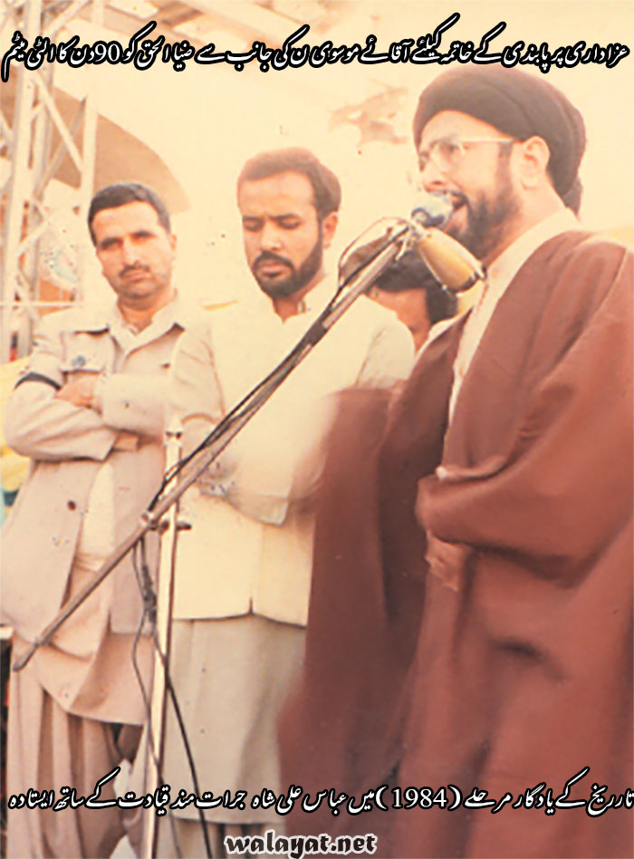 عباس علی شاہ قائد ملت جعفریہ آقائے موسوی سے دیوانہ وار محبت رکھتے تھے جب قائد ملت جعفریہ نے اکتوبر1984میں مارشل لاء ایڈمنسٹریٹرضیا الحق کی جانب سے عزاداری پر پابندی کے خلاف حسینی محاذ ایجی ٹیشن کا آغاز کیا تو عباس علی شاہ ہراول دستے میں نظر آئے۔