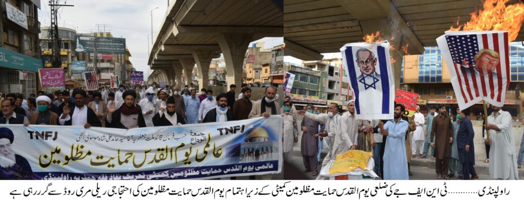 راولپنڈی میں ٹی این ایف جے کی ضلعی یوم القدس حمایت مظلومین کمیٹی کے زیراہتمام امامبارگاہ عاشق حسین تیلی محلہ سے علامہ زاہد عباس کاظمی،میثم تمار، محسن ہمدانی کی قیادت میں مرکزی ریلی نکالی گئی،مری روڈ پر کمیٹی چوک میں خطابات کے بعد مظاہرین پرجوش نعرے لگاکر پرامن طورپرمنتشرہوگئے۔