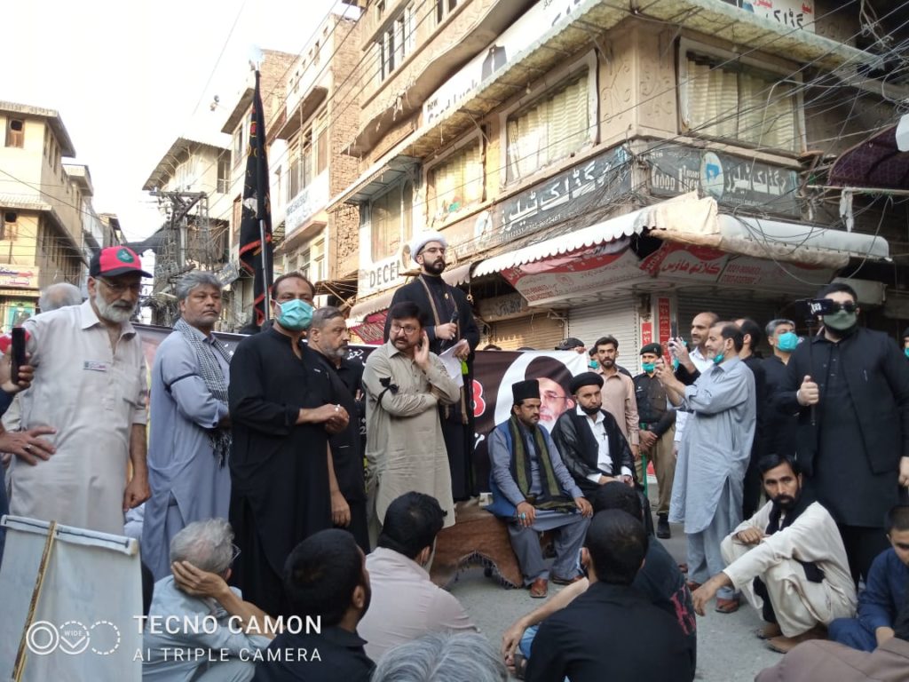 جلوس کی قیادت تحریک ِ نفاذ فقہ جعفریہ خیبر پختونخواہ کے سرپرست ِ اعلیٰ سید اظہرعلی شاہ کاظمی، صوبائی ناظم الامور آغا عباس علی کیانی، صوبائی صدرٹی این ایف جے سید غضنفر علی شاہ صوبائی عہدیداران ذوالفقار جمیل، ابو جعفر کیانی، مولانا اجلال حیدر، شفقت احسان کربلائی، صادق علی حیات، مولانا خورشید جوادی، علامہ موسیٰ رضا، قبلہ جوہر عباس میر، آغا نواز علی کیانی، وقار میر، حاجی عابد علی خا ن،صوبائی کمانڈر مختار فورس(والنٹیرز) حاجی ساجد علی کربلائی،ضلعی صدر ملک عامررضا، ضلعی کنو نیئر لیاقت علی کیانی،امجد علی نے کی، جلوس کے شرکاء مختلف راستوں سے نوحہ خوانی اور ماتمداری کرتے ہوئے چوک شہیداں قصہ خوانی بازار پہنچے جہاں پر جلسے سے خطاب کرتے ہوئے مقررین نے کہا کہ قائدِ ملتِ جعفریہ آغا سید حامد علی شاہ الموسوی کی قیادت میں جنت البقیع کے مزاراتِ مقدسہ کی تعمیر تک احتجاج جاری رکھیں گے انہوں نے ایک قراردادکے ذریعے حکومتِ پاکستان اوروزیراعظم عمران خان سے مطالبہ کیا کہ وہ مدینہ منورہ کے قبرستان جنت البقیع میں اہلِبیتِ اطہار ؑ، رسولِ ؐ خدا کے اجداد، صحابہ کرامؓ اور مشاہیر اسلام کے مزارات ِ مقدسہ کی دوبارہ تعمیر کے لئے کردار ادا کریں۔