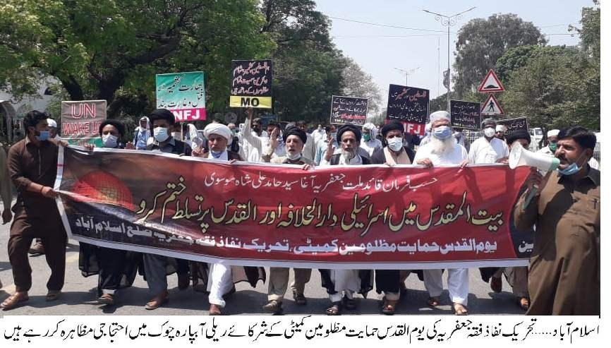 ٹی این ایف جے اسلام آبادالقدس حمایت مظلومین ریلی کی قیادت ٹی این ایف جے فیڈرل کیپٹل کے صدر علامہ بشارت حسین امامی،جنرل سیکرٹری ذوالفقار علی راجہ ،علامہ سیدتصورنقوی ، علامہ سیدفصاحت نقوی ،مولانا وضاحت حسین کاظمی ،مولانامیثم گردیزی، پروفیسرغلام عباس حیدری ،چیف کمانڈر مختار فورس والینٹرز سید نزاکت حسین کاظمی ، سیدتاثیرکاظمی ، چوہدری عمران محمود اور دیگررہنما کررہے تھے۔بعدازاں شرکائے ریلی واپس دربار سخی محمود شاہ بادشاہ پہنچ کر پرامن طور پر منتشر ہوگئے۔ درایں اثناء احتیاطی تدابیرپرعمل کرتے ہوئے وفاقی و صوبائی دارالحکومتوں سمیت ملک بھرکے تمام چھوٹے بڑے شہروں میں قبلہ اول کی آزادی،مظلومین کشمیر و فلسطین کی حمایت ، صیہونی وبھارتی بربریت اور دہشت گردی کے خلاف احتجاجی مظاہرے اور ریلیاں نکالی گئیں ،