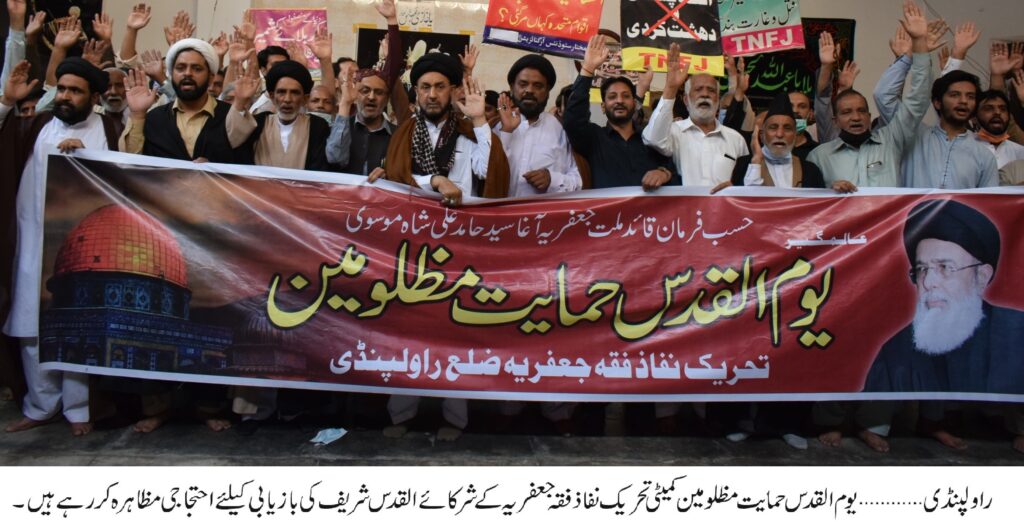 راولپنڈی میںٹی این ایف جے کی ضلعی یوم القدس حمایت مظلومین کمیٹی کے زیراہتمام امامبارگاہ عاشق حسین تیلی محلہ میں احتجاجی اجتماع سے علامہ سیدابوالحسن تقی ، علامہ زاہد عباس کاظمی ،میثم تمار، چوہدری مشاق حسین نے بھی خطاب کیا ۔ٹی این ایف جے کی عالمی یوم القدس حمایت مظلومین کے دفتر میں موصولہ اطلاعات کے مطابق کوئٹہ ہزارہ ٹاؤن ،پریس کلب پشاور ،ڈیرہ غازی خان ،کراچی شاہ فیصل کالونی میں ڈرگ روڈ ،قصر زینب بھکر،بارگاہ ولی العصر ملتان ،امام بارگاہ اڈہ پسروریاں سیالکوٹ،عزاخانہ زہرا لاہور کے علاوہ،مظفر آباد،باغ،دادو،خیرپورمیرس،چکوال،سرگودھاگلگت،فیصل آباد،کوہاٹ،شیخو پورہ،گوجرنوالہ ،جہلم،دینہ ،قصور ،گوجرہ ،خانیوال،بہاولپور،سکھر،نواب شاہ ،سیہون شریف ،نوشہرو فیروز اور دیگر شہرو ں میں بھی یوم القدس حمایت مظلومین کے موقع پر احتجاجی مظاہرے ہوئے اور ریلیاں نکالی گئیں۔