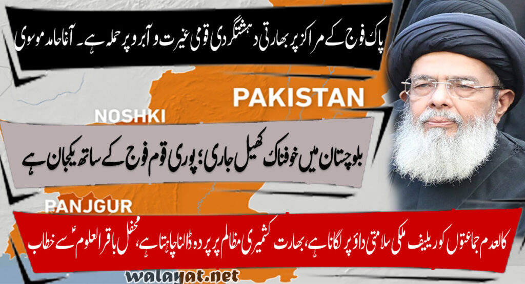 بلوچستان میں خوفناک کھیل جاری ہے، بھارتی دہشت گردی قومی غیرت و آبرو پر حملہ ہے پوری قوم اورہر بلوچ پاک فوج کے ساتھ یکجان ہے، آغاحامدموسوی کا محفل باقر العلوم ؑ سے خطاب