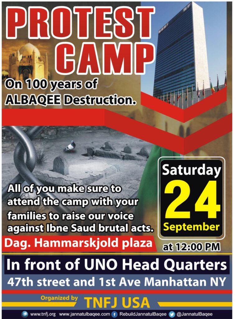 نیویارک (ولایت نیوز)سعودی عرب کے @KingSalman کےجنرل اسمبلی سے خطاب کے دن ٹی این ایف جے امریکہ یو این ہیڈکوارٹر نیویارک کے سامنے ‘البقیع کیمپ’ لگا رہی ہے۔ تشیع کے روحانی پیشوا آقائے حامد موسوی نے مسماری کے سو سال ہونے پر 1444 ہجری کو جنت البقیع کا سال منانے کا اعلان کیا تھا۔