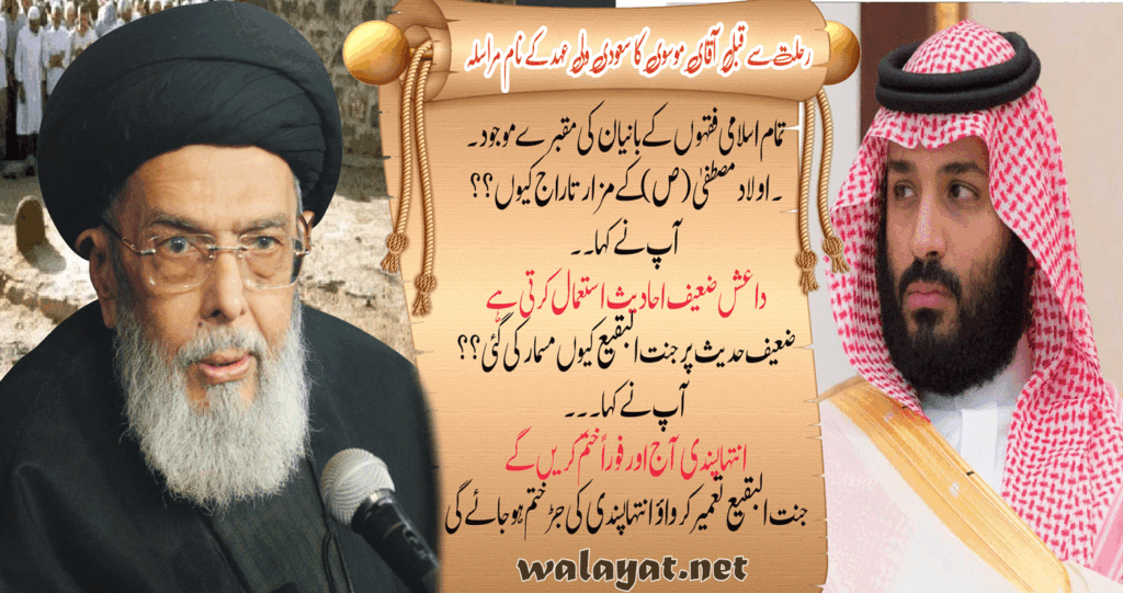 آغا موسوی نے شہزادہ محمد بن سلمان کو یا دلاتے ہوئے کہا کہ آپ اسلامی تاریخ اور تعلیمات پر بھی عبور رکھتے ہیں اور یہ بات آپ سے ڈھکی چھپی نہیں کہ اسلام کے بانی حضرت محمد مصطفی صلی اللہ علیہ وآلہ وسلم، خلفائے راشدین اور تمام اسلامی فقہوں کے بانیا ن امام ابو حنیفہ، امام شافعی مالک حنبل ؒ تمام کے مزارات موجود ہیں مزارات کو گرانے کا فتوی دینے والے ابن تیمیہ کی اپنی قبر دمشق کے مقبرہ صوفیا میں پختہ حالت میں موجود ہے۔خود آپ کے والدشاہ سلمان بن عبد العزیز کی جانب سے بانی اسلام نبی کریم ؐکے مزار(حرم)کے خادم کا ٹائٹل رکھناہی مزارات کے عین اسلام ہونے کی بڑی دلیل ہے۔
