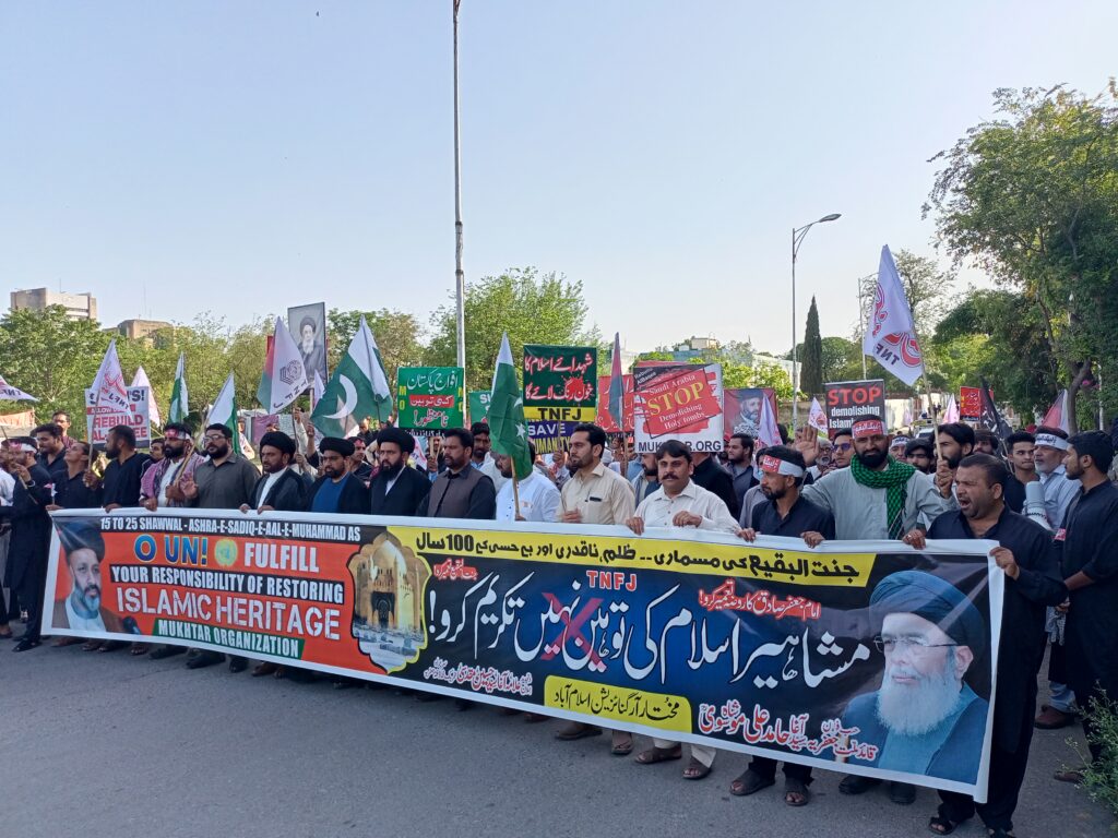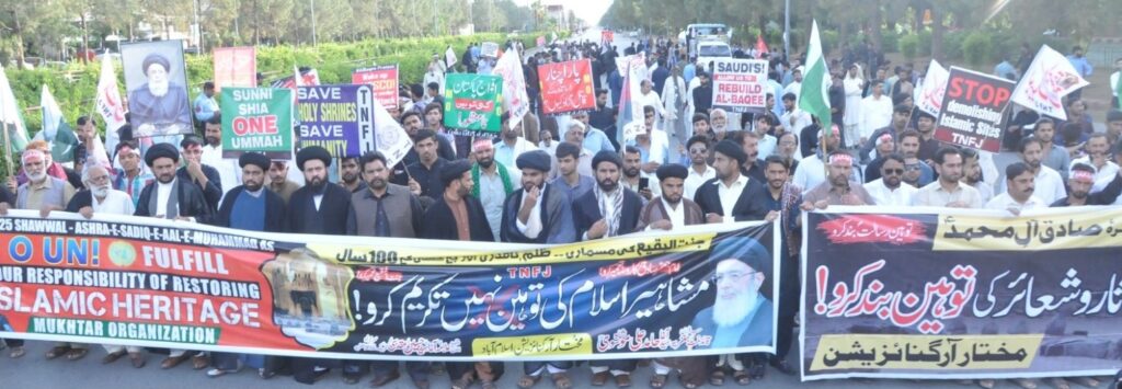 مختار آرگنائزیشن پاکستان (ایم او) کی جانب سے ڈی چوک میں شرکاء ریلی سے خطاب کرتے ہوئے مختار آرگنائزیشن کے شریک چیئرمین سید حسن کاظمی نے خطاب کرتے ہوئے اقوامِ متحدہ سمیت تمام عالمی اداروں پر زور دیا کہ وہ انسانیت کی فلاح اور کامیابی چاہتے ہیں تو اپنی تمام تر توانائیاں جنت البقیع اور جنت المعلیٰ کے مزاراتِ مقدسہ کی از سرِ نو تعمیر اور عظمتِ رفتہ کی بحالی کی طرف صرف کریں اسی میں تمام انسانیت کی کامیابی کا راز مضمر ہے۔ اس موقع پر مختار آرگنائزیشن کے ایڈیشنل سیکرٹری جنرل ملک ابو زمار کی جانب سے پیش کردہ ایک قرارداد متفقہ طور منظور کی گئی جس میں اس امر پر افسوس کا اظہار کِیا گیا کہ پہلی جنگِ عظیم کے بعد سر زمینِ حجاز میں برطانوی سامراج کی سازش کے تحت مسلمانوں کے مقدس مقامات جنت البقیع اور جنت المعلیٰ کی مسماری کو سو سال پورے ہو چکے ہیں لیکن آج بھی اسلام کے محسنوں۔۔! اہلِ بیتِ اطہارؑ، پاکیزہ صحابہ کبارؓ، امہات المومنینؓ اور نبیؐ کی پیاری بیٹی حضرت فاطمہ زہراؑ کے مزارات حسرت و یاس کی تصویر بنے ہوئے ہیں۔ اس ناقدری کا نشانہ امام صادق علیہ السلام کا مزار بھی ہے جنہیں ساری دنیا سائنسی و علمی انقلاب کا سرچشمہ تسلیم کر چکی ہے اسی لئے آج ملتِ جعفریہ کے جوانوں کی نمائندہ تنظیم مختار آرگنائزیشن پاکستان سمیت دنیا بھر میں ماتمی احتجاج کر رہی ہے۔ قرارداد میں باور کرایا گیا کہ آج ساری دنیا حتیٰ کہ سعودی ولی عہد بھی یہ بات تسلیم کر چکے ہیں کہ مغرب کے مکروہ منصوبوں کے تحت تخلیق کی گئی شدت پسندی نے اسلام کو سب سے زیادہ نقصان پہنچایا ہے لہٰذا یہ اجتماع قائدِ ملتِ جعفریہ آغا سید حامد علی شاہ موسویؒ کی زندگی کے آخری مکتوب (بنام سعودی وزیرِ اعظم و ولی عہد) کے الفاظ کو دہراتے ہوئے شہزادہ محمد بن سلمان سے مطالبہ کِیا گیا کہ اپنے وژن 2030ء مطابق شدت پسندی پر ایک اور کاری ضرب لگاتے ہوئے جنت البقیع و جنت المعلیٰ میں بنتِ نبیؐ حضرت فاطمہ زہراؑ، سردارِ جنت امام حسنؑ فقۂ جعفریہ کے بانی امام جعفر صادقؑ سمیت 4 آئمہ اہلبیتؑ، حضرت خدیجۃ الکبریٰؑ، حضرت عائشہؓ و حفصہؓ سمیت 9 امہات المومنینؓ، پاکیزہ صحابہ کبارؓ کے مزارات کی عظمتِ رفتہ کی بحالی کا اعلان کر کے عالمِ اسلام کے دلوں کو جیت لیں اور اپنی نیک نامی میں لامتناہی اضافے کا سامان کریں۔