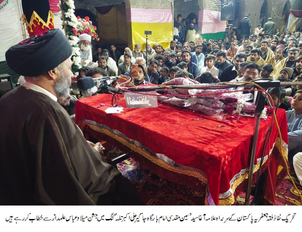 ان خیالات کا اظہارانہوں نے ٹی این ایف جے ضلع تلاگنگ کے صدرسیداسدحسین شاہ کی میزبانی میں امام بارگاہ جاگیر علی اکبر چکوال روڈ تلہ گنگ میں عظیم الشان جشن میلاد عباس علمدار علیہ السلام سے خطاب کرتے ہوئے کیا۔ انہوں نے باور کرایا کہ قائد اعظم کے احسانات کا بدلہ ان کے نظریات و افکار کا احیاء کے سوا کچھ اور نہیں ہوسکتا اسی عظیم اور مقدس مشن کے لیے ٹی این ایف جے نے جدوجہد کی اور نظریہ اساسی کو بچایا۔
