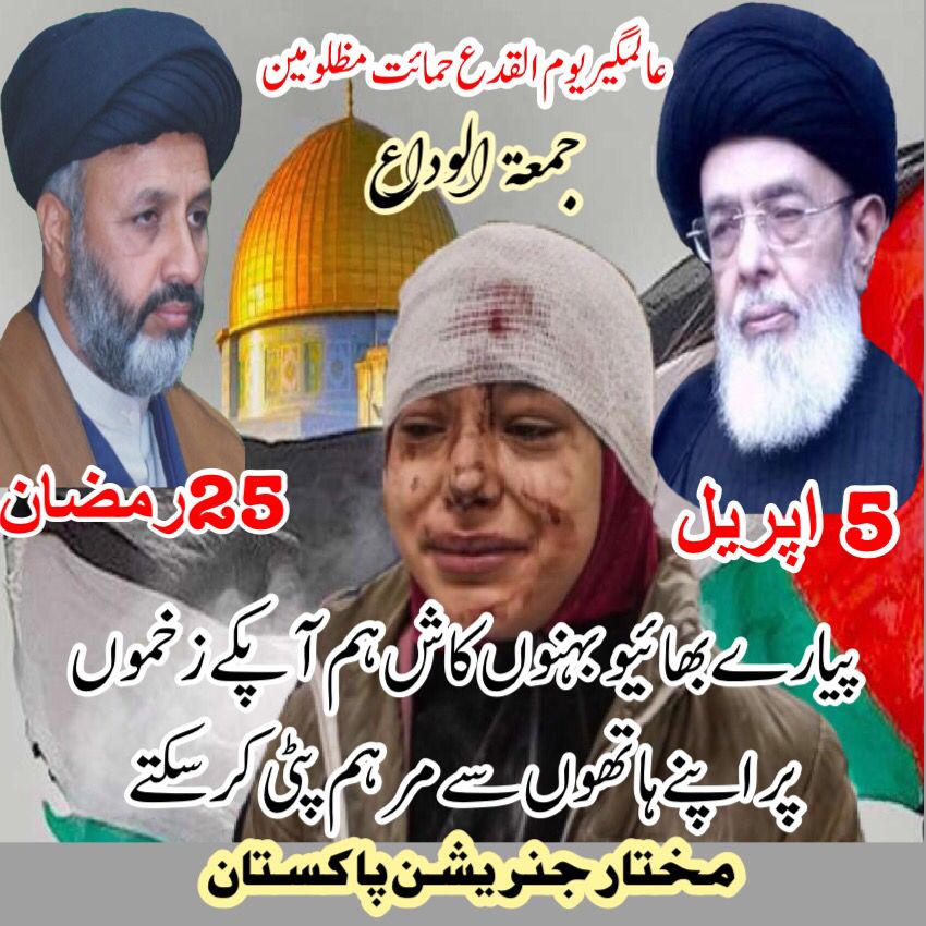 دنیائے مظلومیت سے اظہارِ یکجہتی کیلئے جمعۃ الوداع کو عالمی یوم القدس حمایتِ مظلومین منایا جائیگا۔ تحریکِ نفاذِ فقہ جعفریہ