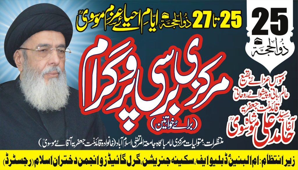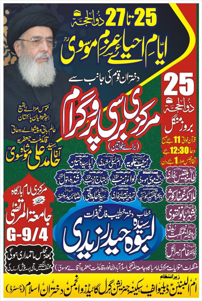 اس مناسبت سے انجمن دختران اسلام، ام البنین ڈبلیو ایف، سکینہ جنریشن گرلز گائیڈز کے زیراہتمام 25 ذو الحجہ کو امام بارگاہ جامعۃ المرتضی جی نائن فور اسلام آباد مدفنِ آقائے موسوی میں خواتین کی عظیم الشان مجلس عزاء منعقد کی گئی۔