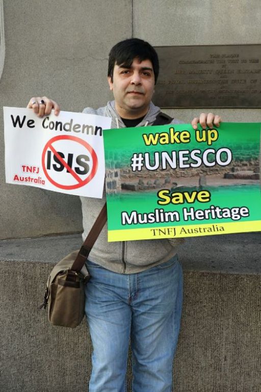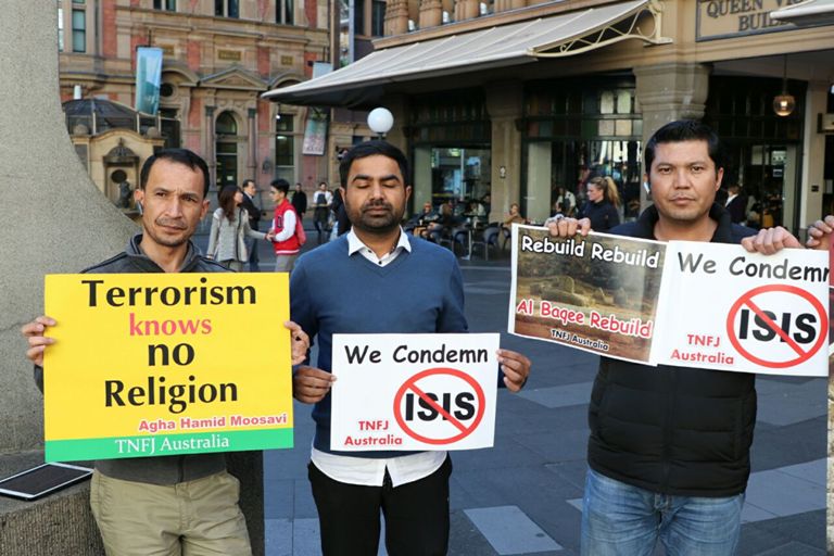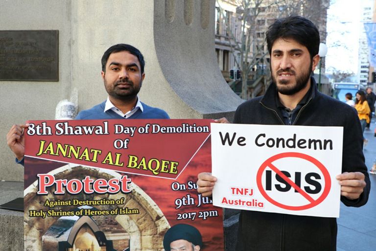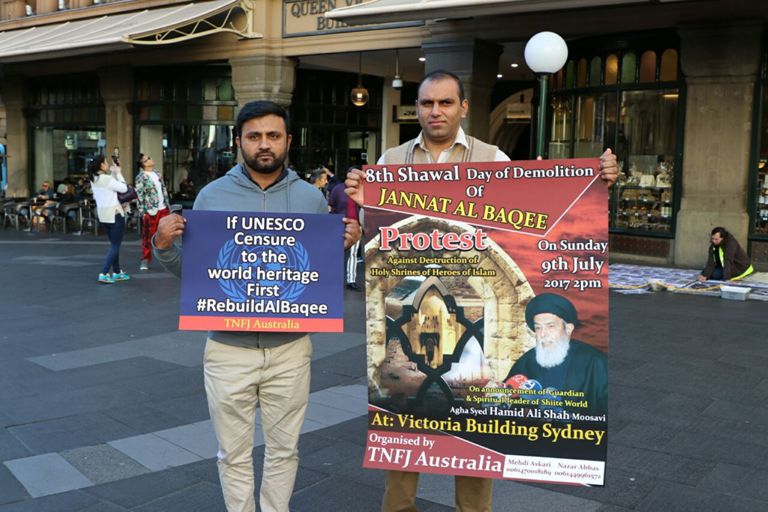 سڈنی  (ارشاد احمد سعید) جنت البقیع و جنت المعلے کے مزارات مقدسہ کی مسماری  اوراسلامی آ ثا رکی مسلسل تاراجی کے خلاف  تحریک نفاذ فقہ جعفریہ آسٹریلیا کے کارکنان نے قائد ملت جعفریہ آ غا سید حامد علی شا ہ موسوی کی کال پر لبیک کہتے ہوئے 9 جولائی کو کوئین وکٹوریہ بلڈنگ سڈنی کے سامنے احتجاجی مظاہرہ کیا۔