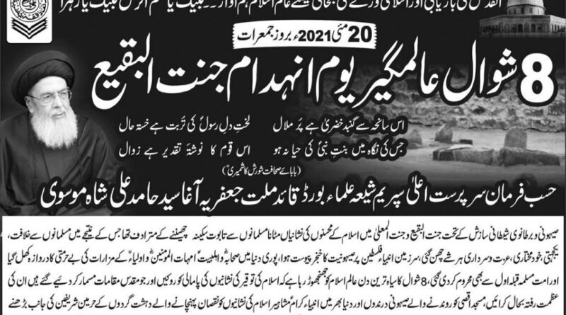 Read Moreیوم انہدام جنت البقیع کا مرکزی احتجاجی ماتمی جلوس آج امامبارگاہ ناصر العزاء سے برآمد ہو گاتمام مکاتب فکر مزارات