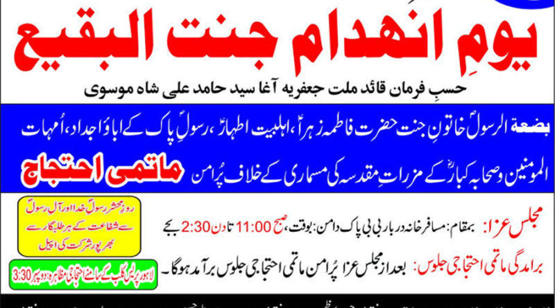 شوال -عالمگیر یوم انہدام جنت البقیع (ظلم عظیم کیخلاف صدائے احتجاج) 8شوال (1924) تاریخ انسانی کا وہ سیاہ و تاریک